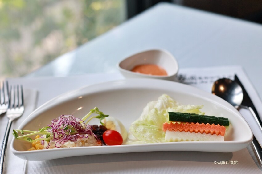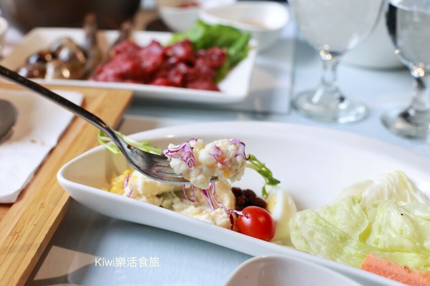 沙拉盤上有新鮮的生菜沙拉、馬鈴薯泥,淋上自製千島醬味道很香濃卻也很清爽。