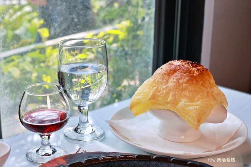 餐前紅酒、酥皮濃湯陸續上桌,餐前紅酒,原以為紅酒的酸澀感很重,沒想到是一杯淡淡酸甜的紅酒,很適合來搭配牛排,香氣讓我們不自覺得也喝上好幾口。