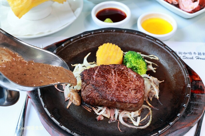 家園的厚菲力9oz這厚度太強了,整個端上桌後,此時工作人員為我們掀蓋,啊!我們都驚訝了,這燒燙燙的鐵板燒那聲響在我們耳邊迴盪著,牛排給的霸氣,光視覺效果太吸引人,主廚特製的蘑菇醬、黑胡椒醬會一併送上,可以一起品嚐。