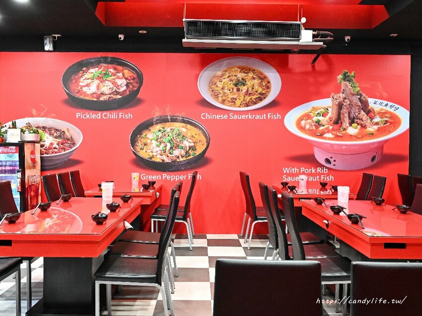 老梗談鐵鍋燉魚整間店紅通通的,牆面上還有誘人的美食圖片可以參考,空間寬敞舒適,乾淨明亮,除了四人的座位,還有六人座位,非常適合多人聚餐呢