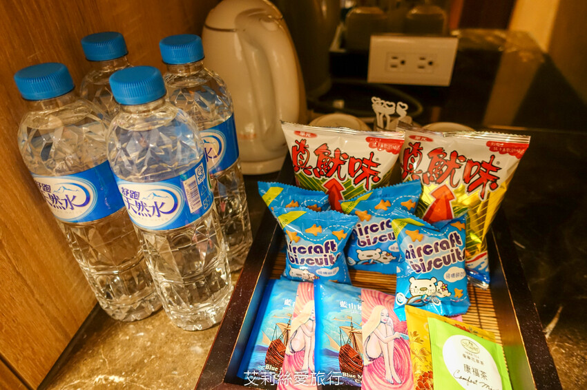 四人房有四瓶常溫舒跑瓶裝水,還有提供小餅乾點心。