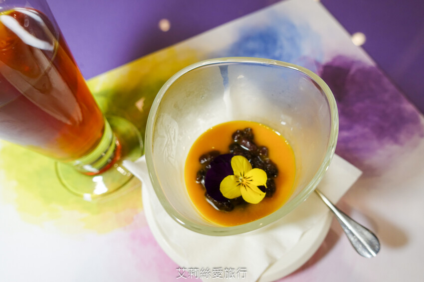 甜點是紅豆芒果奶酪,上面還有現摘的三色堇食用花。