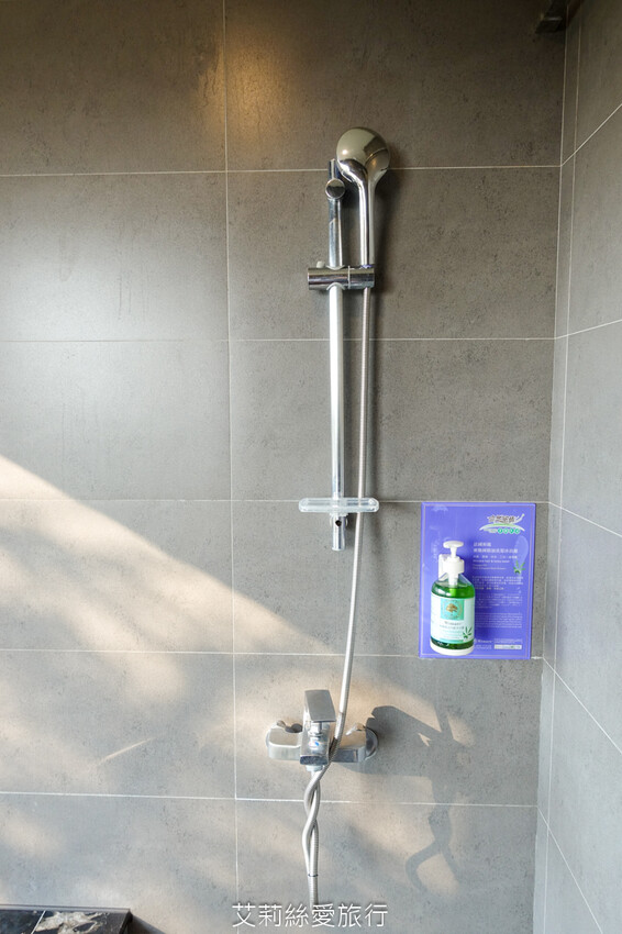 浴池旁可淋浴,牆上有三合一洗沐乳。
