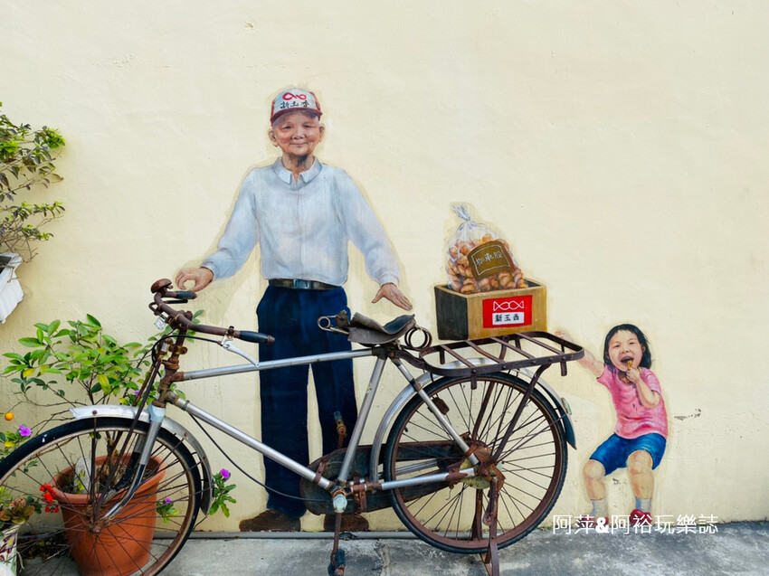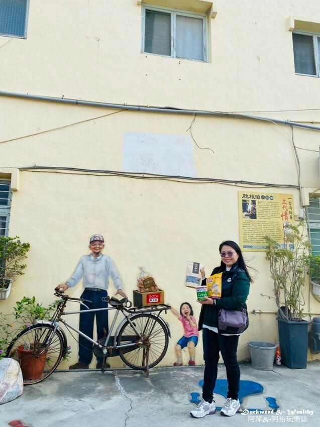 「新玉香手工麻花捲」走進復古三合院,就可以看見牆面上彩繪畫像新玉香創始人