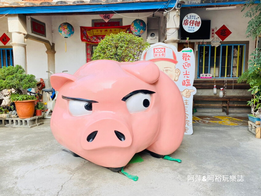 「新玉香手工麻花捲」在三合院裡擺放著一頭豬的造型物,