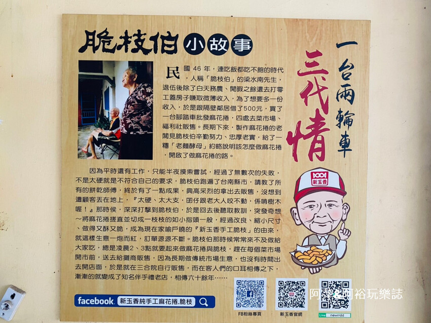 「新玉香手工麻花捲」牆上介紹新玉香靈魂人物[脆枝伯]所創造出的伴手禮小故事