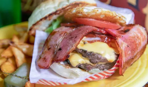 翻開裡面其實也很單純,就是蕃茄,切得比較碎的生菜,肉醬和一片起司,味道的來源除了餅皮油香外,便是肉醬,據說是該店的祖傳祕方,和一般的塔可餅醬有一點不同,以個人的認知而言,味道比較沒那麼重,那麼油、那麼鹹,整體搭配油、鹹、香、甜、酸、鮮、五味雜陳,口感上有餅的微咬勁,肉醬和起司的綿化,蕃茄和生菜絲又補充了咀嚼端的滋潤和清爽,真心覺得涮嘴到不行,即便沒有酒、沒有飲料,我都可以輕鬆解決一盤四個。
