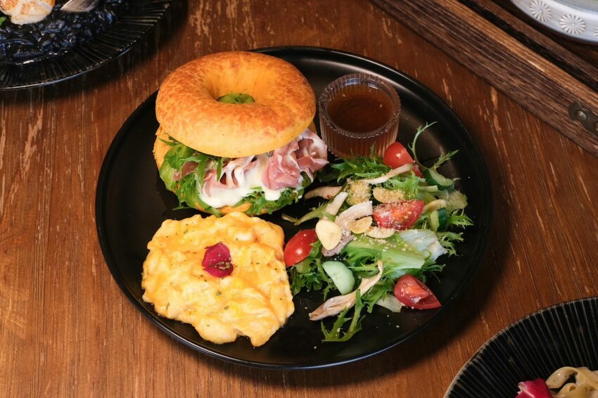 ▼上午供應的伊比利生火腿起司貝果輕食,包含嫩蛋、沙拉和一杯美式咖啡或茶,呈現金黃色澤的貝果,嚼勁好咬充滿香氣,中間夾著鹹香的生火腿和起司,還有清爽的芝麻葉增加口感,吃完整份會很有飽足感。