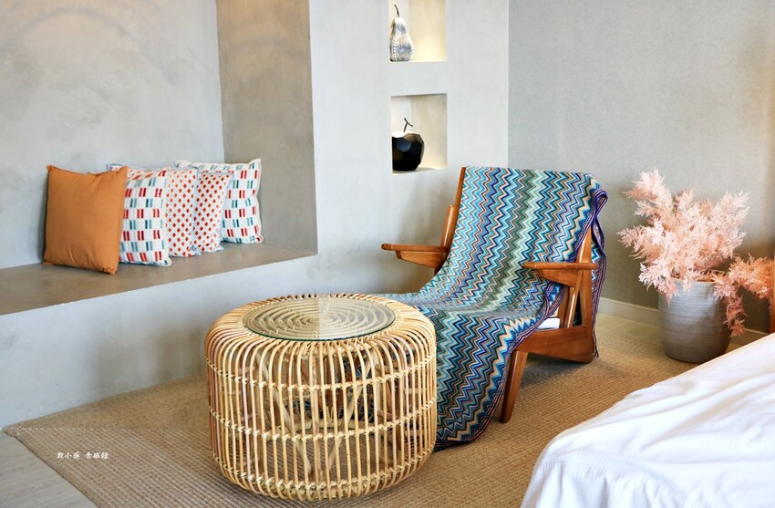角落的躺椅設計有波希米亞風格,竹型玻璃圓桌挺特別,怪不得入住此房的人都說不想出去只想在房裡好好耍廢