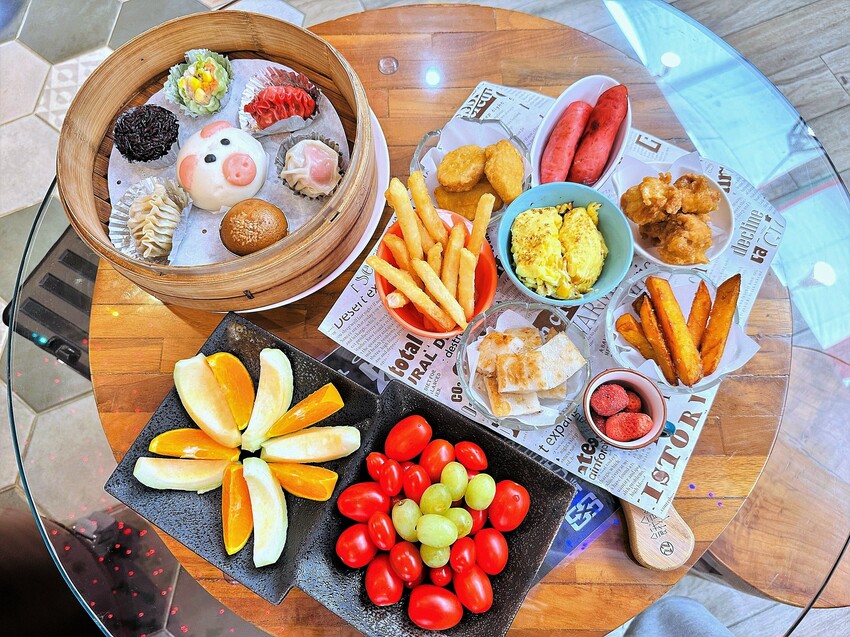 早餐非常豐盛 整體搭配讓人看了口水直流 精選蒸籠小點 有鹹的有甜的都很好吃!