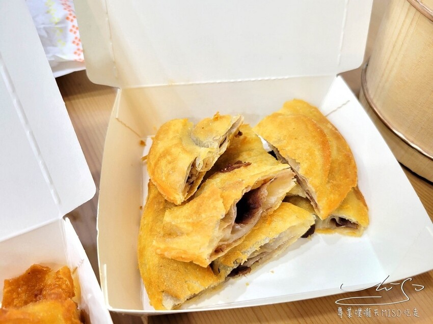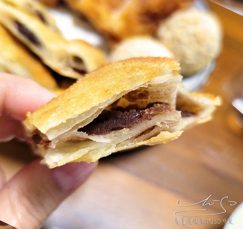吃之後~歐某!這是扁韭菜盒的皮包紅豆啊!皮也太脆了吧!裡面一層一層帶Q