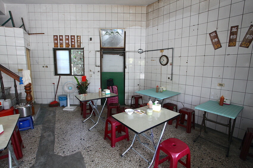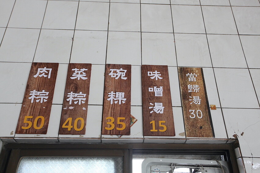 牆面貼上菜單供顧客點餐參考,菜單有肉粽、菜粽、碗粿、味噌湯及當歸湯等。