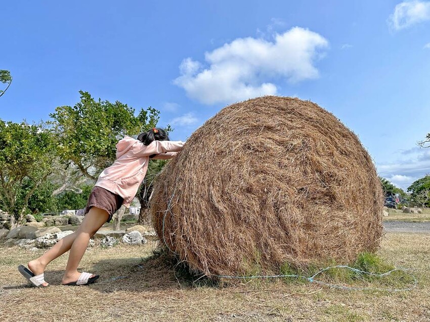 一來到開門見山樹屋咖啡整個大園區內,蔬果姐妹整個就在這裡玩開了!還天真地想要比賽推動這些”乾草堆”!