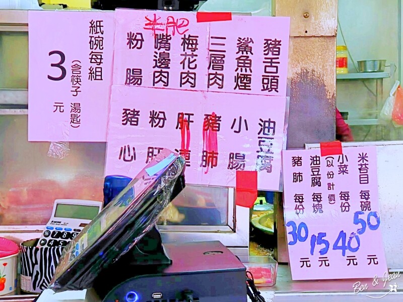 小菜每份40元,必點粉腸,油豆腐每塊15元