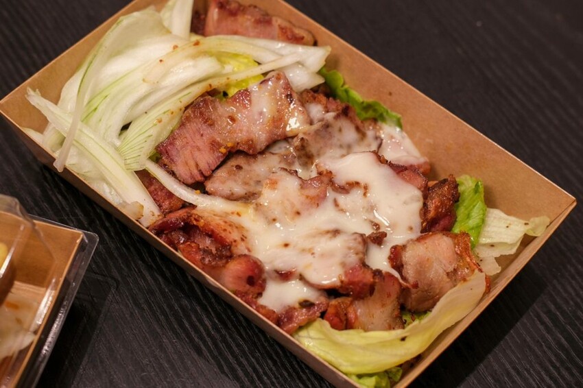 ▼肉肉控會愛的經典雙享餐,夾入柴燒脆皮豬和柴燒厚切豬兩款肉品,以特製醬料醃製入味再高溫炙烤的脆皮豬,搭配油脂均勻的炭烤梅花厚切豬,調味鹹鹹香好涮嘴。酥脆中吃得到滿滿的過癮肉感,搭配新鮮的生菜更添清爽。