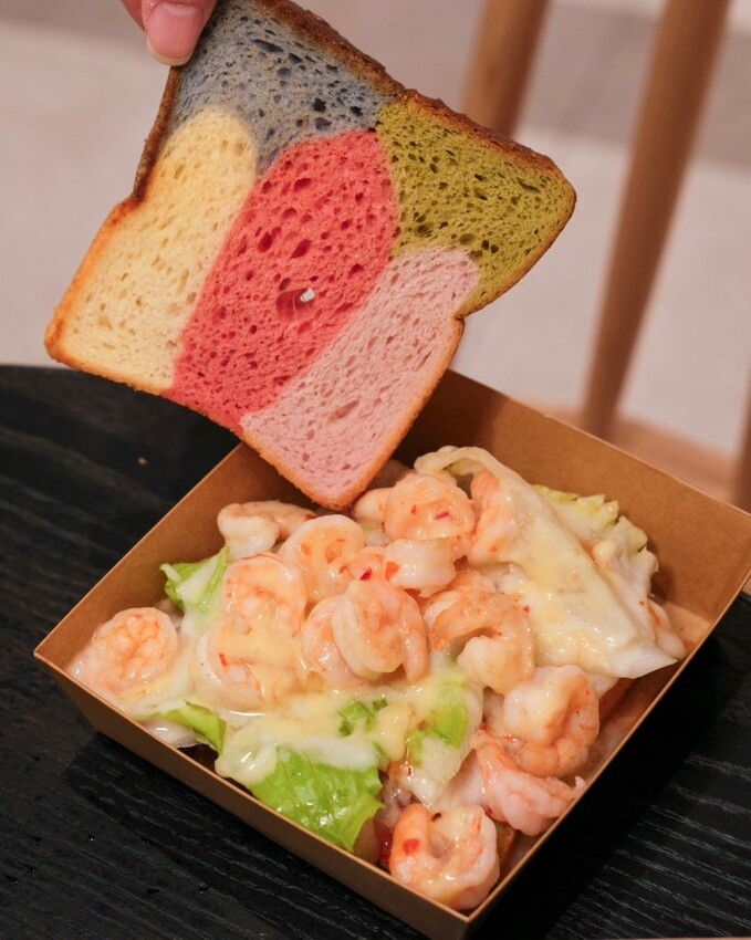 ▼賣相誘人的熔岩彩虹鮮蝦吐司,以天然果汁帶來夢幻色澤,在烤後吃起來口感外酥內軟,帶有微微的香甜感。