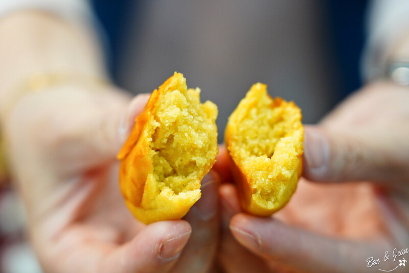 以花蓮在地蕃薯所精製,做法是先將蕃薯去皮、蒸熟、搗泥、炒餡、冷卻、手握成型、烘焙而成