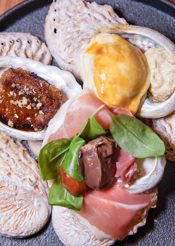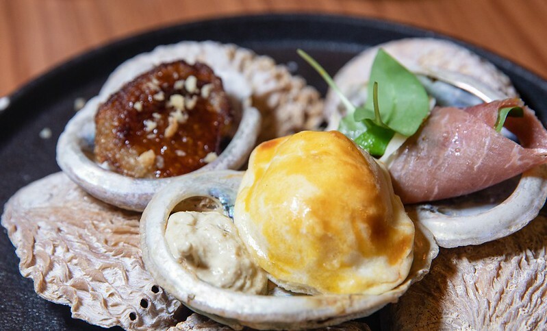 炭烤花生(上)/椒麻宜蘭有機白玉米(右下)/南投檸檬蜂蜜油漬香菇(左下)。那花生不知怎烤的,香氣有巴到花生上。椒麻玉米帶點沾唇如不黏舌的微麻,辣、甜,加上玉米爆出的甜,好吃得亂七八糟。最後的香菇也很特別,淡著輕輕淡淡的檸檬草香和蜂蜜的甜香,原來香菇也可以這樣玩。