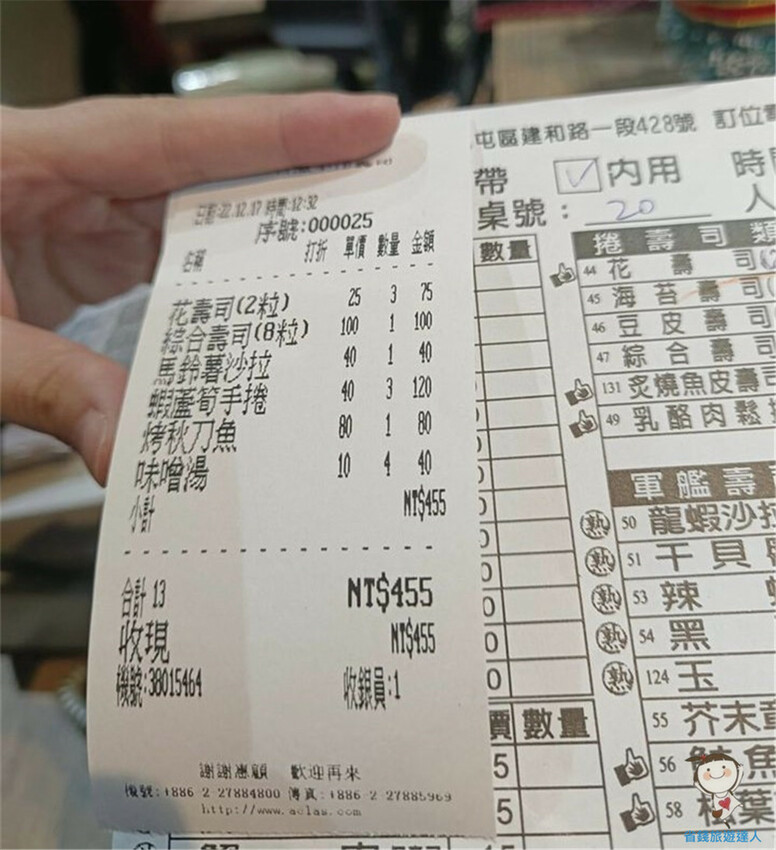 最後結帳總共$455,我們四個人因為晚上還要吃大餐,所以中午簡單吃