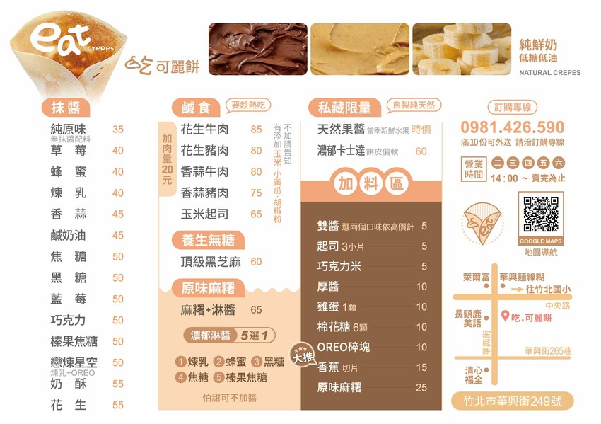 eat吃可麗餅位於竹北的華興街靠近中央路,就在發哥港式雞蛋仔旁。