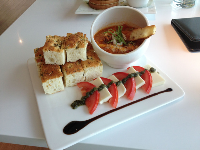 一旁的切塊佛卡夏可以搭配蕃茄海鮮濃湯沾取食用