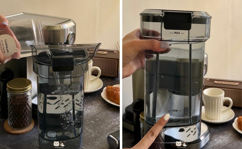在咖啡機使用前須先將水箱裝入清水,請裝在MIN~MAX範圍中,避免溢出或是沖泡過程缺水,水箱可以拆卸提取裝水,以免淋濕機身;