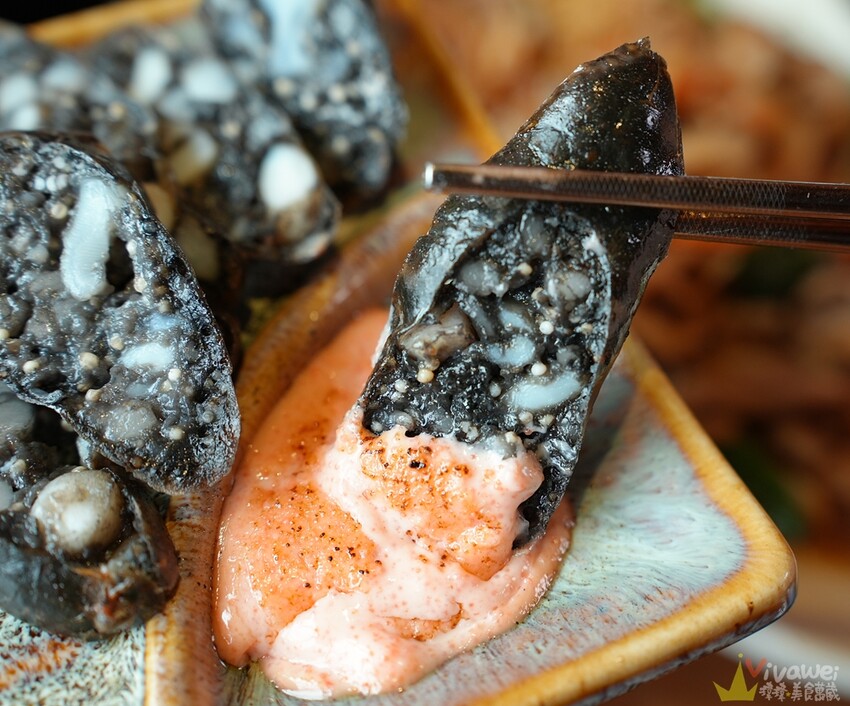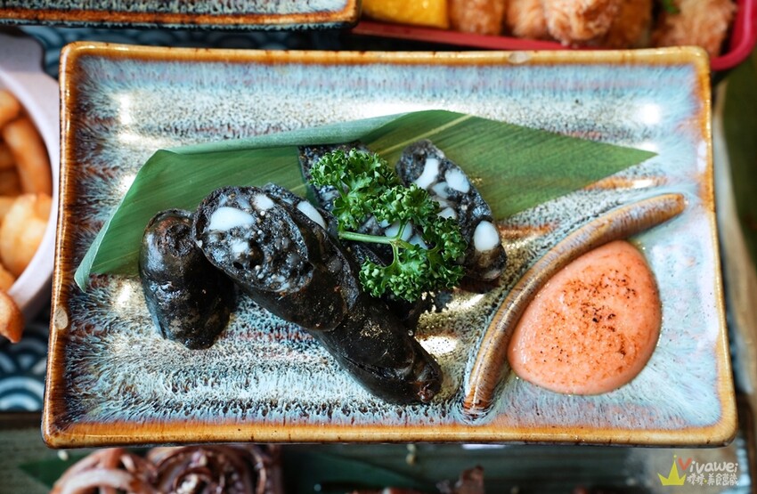 ▲加了黑色墨魚汁的墨魚香腸,內餡可以吃到新鮮的花枝塊,一旁還附了明太子醬可以沾著吃!口感飽滿紮實有嚼勁!