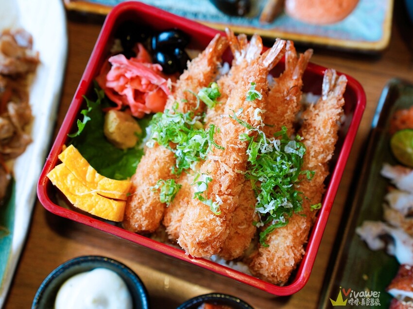 ▲海老蝦丼飯的賣相很棒!裡面有五隻炸蝦~可以搭配一旁的黑豆、紅薑、山葵醬、玉子燒享用!