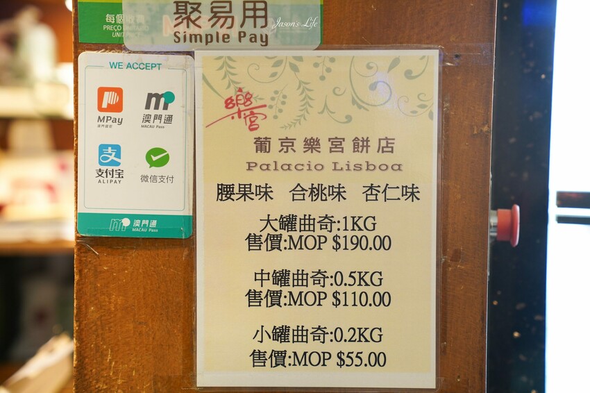 曲奇餅有分大、中、小盒,價格如下:大190元澳門幣、中110元澳門幣、小55元澳門幣
