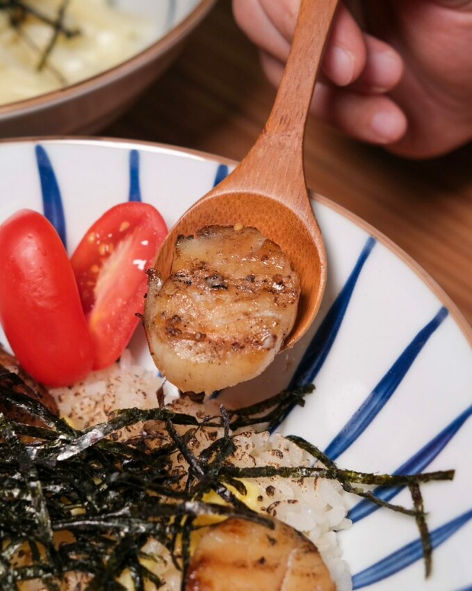 ▼還沒吃就聞到香味的奶香炙燒干貝丼,嚴選生食級大干貝以火烤炙燒,再日式美乃滋以及明太子醬,干貝帶點軟嫩帶點焦香,推薦把整碗拌在一起享用,在嘴裡散發鮮美甘甜的海味~