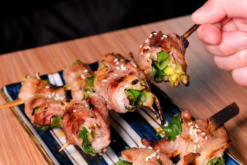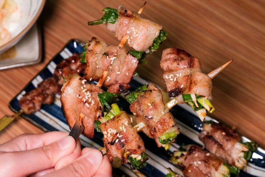 ▼烤至入味的牛肉豬肉串系列,塗上店家特製的燒烤醬料,再搭配水蓮和蔥段點綴加分,油脂與蔬菜香氣融和恰好,咬起來都不會乾乾的,在嘴裡爆出香甜肉汁及水分。