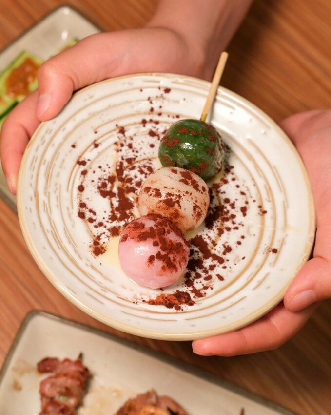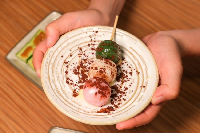 ▼最後的甜點來串法芙娜糰子剛剛好,日本進口的三色糰子,咬起來Q彈不黏牙,淋上煉乳和法芙娜可可粉,甜甜香香的滋味很特別。