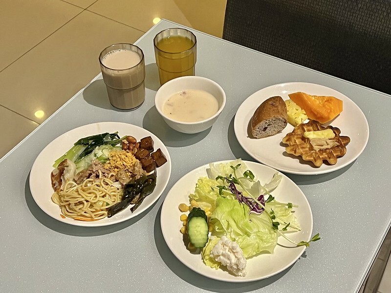 河堤美學商旅的炒麵非常彈牙,貝果也是其他飯店早餐少見的品項,煎餃、薯球、濃湯通通都好吃,推薦大家不要錯過~