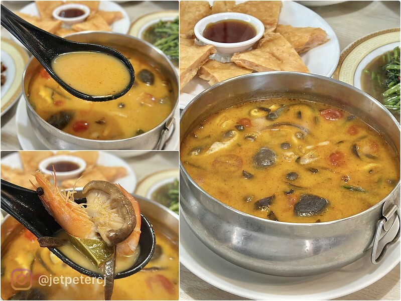 吃飽後當然要來碗酸辣蝦湯,這可是泰國最家常的湯品,加入超多蕈菇跟番茄增添香氣,一口咬下還會噴出酸辣的湯汁,非常美味的海鮮湯品,整鍋吃個精光~