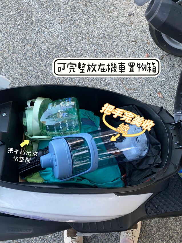 也因為把手很貼合瓶身,放在機車置物箱食,把手不會佔用空間,剛好可以跟我另一個小水壺做一下比較(哈!)