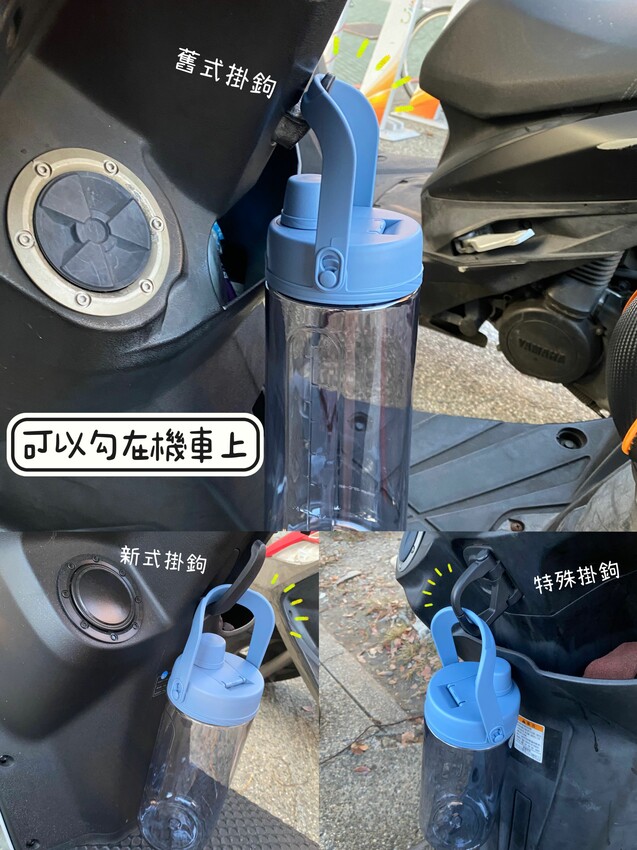 水壺也可以掛在機車上,經過我的測試,像我最近換新車,新式把手會比較難掛,需要兩隻手輔助,會有一個角度,一般傳統的跟特殊的都可以一手輕鬆掛