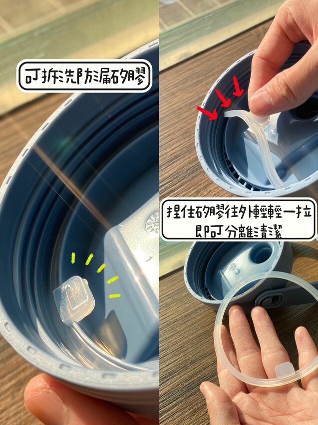 而上蓋的防漏矽膠圈是屬於可拆式的,只要拉住凸出的矽膠,輕輕往外拉就可以輕鬆拔起清潔