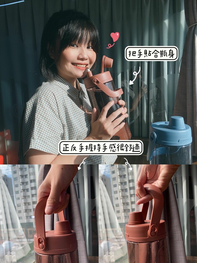 不得不說,我很喜歡它的握把設計跟握持手感,正手、反手都不會覺得不舒服,要喝水時,把手還可以完全貼合瓶身
