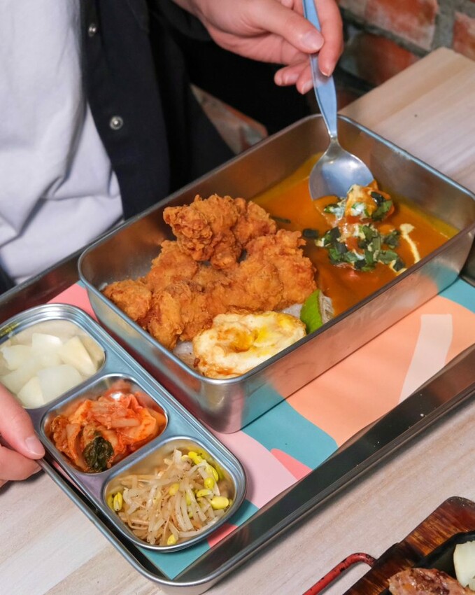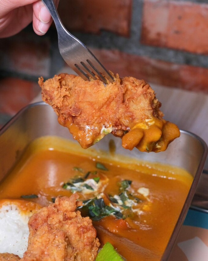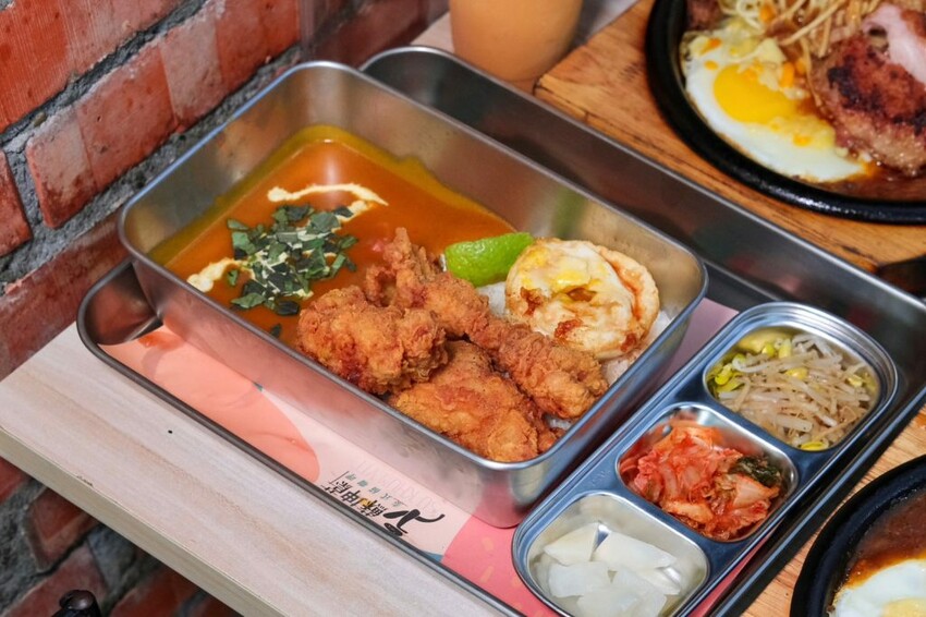 ▼充滿泰式風味的炸雞塊咖哩飯,裝在鐵盒裡面看起來討喜又可愛,炸雞的尺寸相當大塊,外酥脆內多汁很好咬,搭配半熟的炸蛋讓口感升級,米飯則使用泰國在地的特色長米,搭配微辣的香濃咖哩醬剛剛好,整份吃完會很有飽足感。