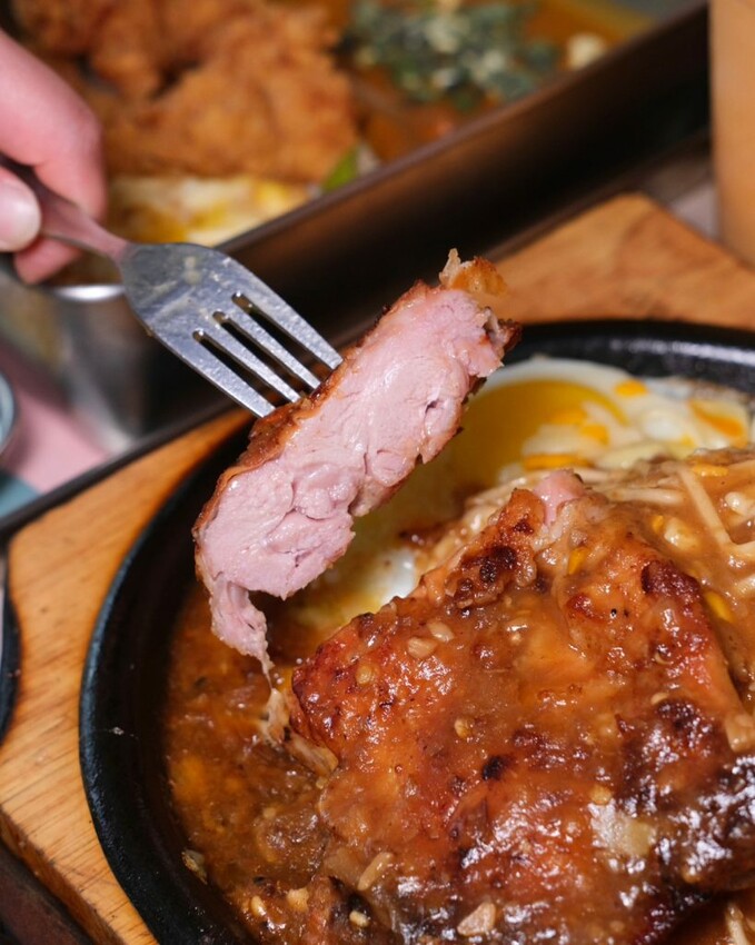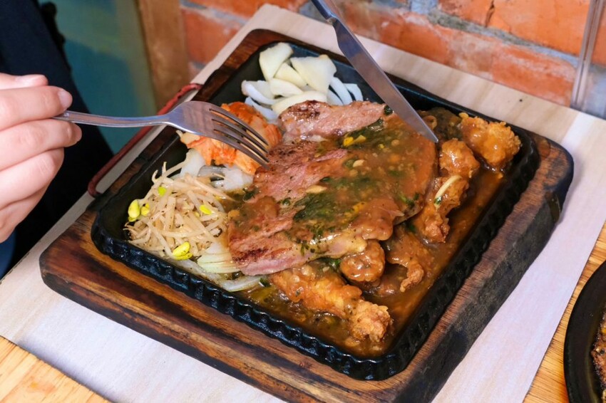 ▼適合肉肉控的雙拼主餐組合,能同時吃到沙朗牛排和炸嫩里肌,超過巴掌大的沙朗牛排霸氣鋪滿鐵盤上,肉質勁中充滿肉感,淋上特製的九層塔醬汁香氣十足,底下還有整排的炸嫩里肌,炸皮吸滿了醬汁的精華,搭配緊實的口感越吃越涮嘴,這個價錢來說實在太佛心!