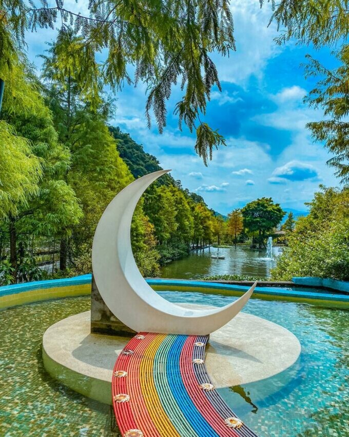 位在宜蘭員山鄉⌜鳳梨屋水上莊園⌟,是宜蘭為數不多的水上露營體驗山莊,園區內佈置不少網美打卡景點,尤其是設立池中的月亮造型裝置藝術,躺在上面拍照,好像能滿足從小體驗在天空自由翱翔的想像,後方彩虹步道好比移動時留下的美麗軌跡,美中不足地方是池底為設計星型的圖案,否則這趟飛行夢真能完美實現呢~ 最後提醒只要繳交參觀費,就允許在園區拍好拍滿,不必住上一晚喔。
