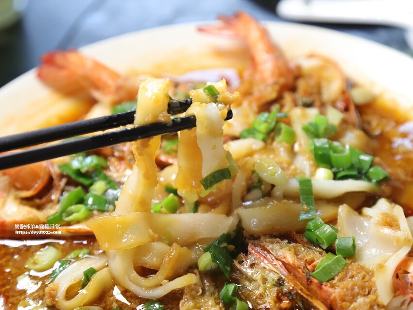 中間來有粄條麵可以沾蒜蓉草蝦的醬汁吃,一條條超厚又細的板條麵,每一條板條麵都沾滿醬汁,麵條味道鹹度剛剛好。
