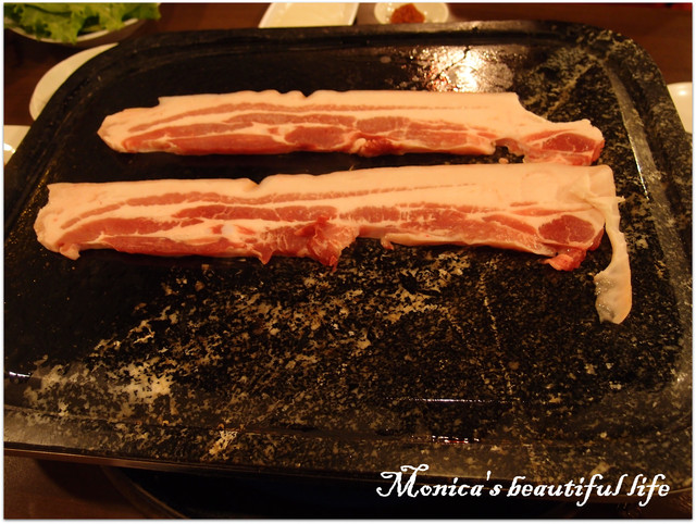 先上來的是石板五花肉,兩大條的五花肉就放在石板上滋滋作響,看起來超好吃的!!