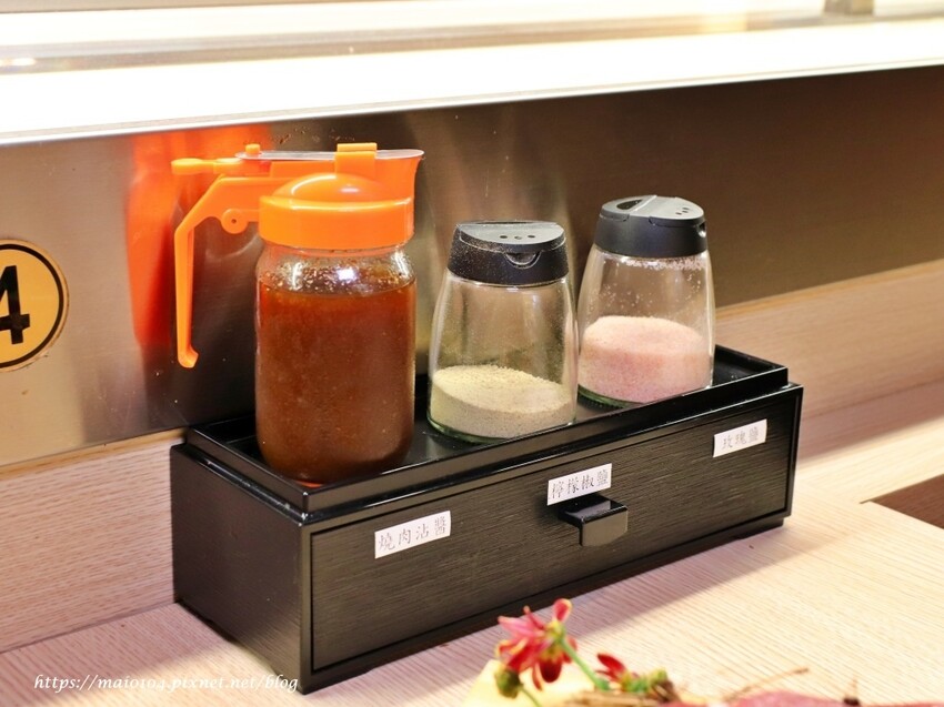 桌上備有玫瑰鹽、檸檬椒鹽及燒肉沾醬