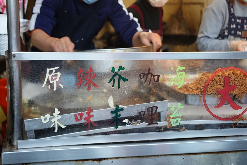 攤車上都是滿滿的備料,有高麗菜、酸菜、蛋酥、肉鬆、花生糖粉、紅燒肉、菜脯等一共七種餡料。