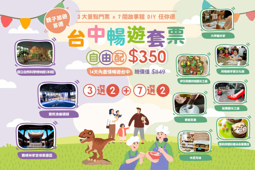 「台中暢遊套票」精選10個台中熱門景點與故事館所,寓教於樂的性質非常推薦給想要來台中親子旅遊的你!不論是認識科學、海洋及歷史,或是想動手玩DIY、購買伴手禮,只要擁有這張套票就可以實現,一起和孩子來台中玩一波吧~