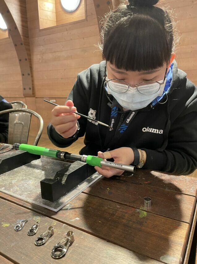 寶熊漁樂碼頭最特別的體驗是釣竿組裝DIY,從釣竿握柄到導環上膠固定,每一個步驟都需要細心穩定才能完成,最後組好就可以帶著釣竿去釣魚!