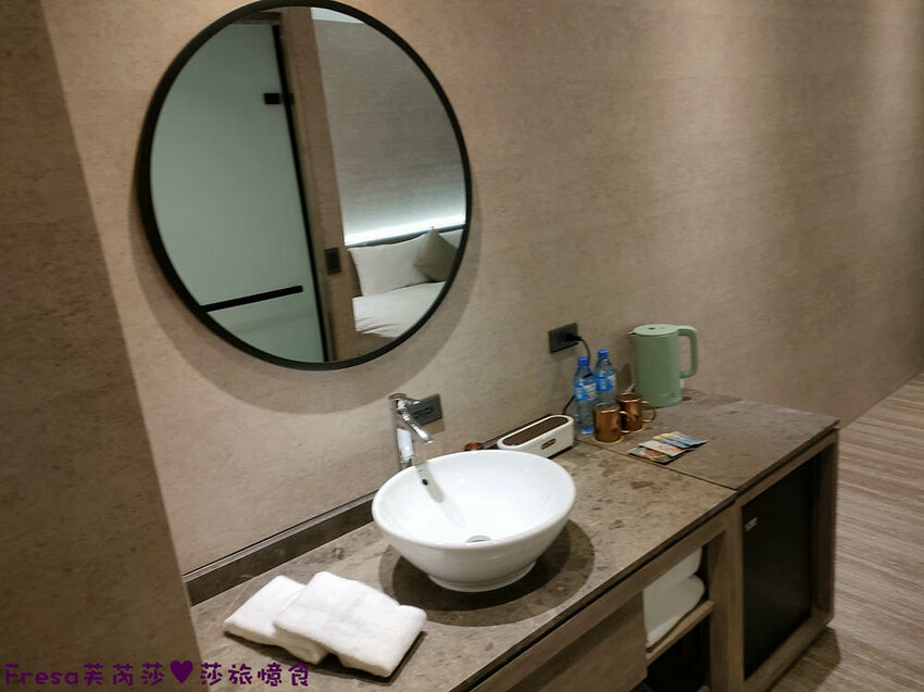 檯面有煮水壺、瓶裝水、盥洗備品.