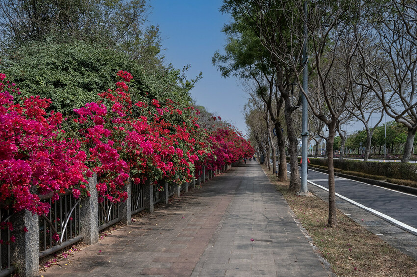 東大公園 3月九重葛花牆 誇張的盛開著,公園內其實也很值得走走裡面是圍繞滯洪池的諾亞方舟步道、空中木棧道可以運動賞景,IG夯燒九重葛花瀑 推薦來這裡欣賞 超過500公尺不管你怎拍都是唯美的紅色花牆,想站著蹲著坐著都可以!更有人特地帶著超精細人形玩偶(絕對心愛之物) 外拍!!