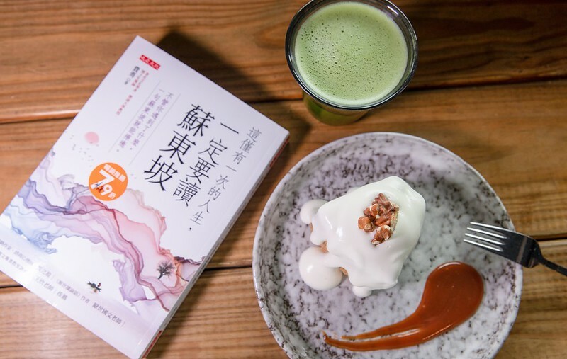本來嘛這個單元叫一杯咖啡、一份甜點、一本書,應該的是咖啡,但看到menu上寫著小山園手刷抹茶(100元)便不加思索的點了。上桌時覺得這抹茶也刷得太美了,後來才發現那一抹是杯子的外緣。這杯子選得真是好。杯子選得好之餘,這抹茶也刷得香,刷得好喝,尤其是搭配略甜的甜點,真是對味極了。上面的抹茶泡泡也頗為精緻,難得。